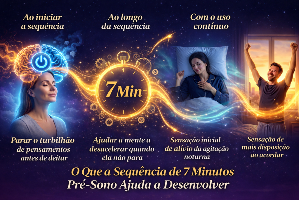 Aplique a Sequência de 7 Minutos Pré-Sono por 7 dias seguidos. Uma semana para testar e sentir sua mente desacelerar. É um método simples e 100% natural que atua exatamente nos minutos antes de deitar — o momento em que sua mente insiste em continuar ligada. Sem remédios. Sem técnicas longas. Sem enrolação. Em apenas 7 minutos por noite, você inicia um processo direto de desaceleração mental. Não promete milagre. Ensina sua mente a sair do modo alerta. Ideal para quem está cansado no corpo, mas com a cabeça acelerada.